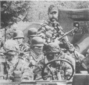 | 1973 gründete Karl-Heinz Hoffmann (r. oben) die »Wehrsportgruppe Hoffmann« (WSG). Durch militärische Ausbildung wurden die Mitglieder auf Terroranschläge vorbereitet. 1980 ermordeten Mitglieder der Wehrsportgruppe den jüdischen Verleger Shlomo Levin und seine Lebensgefährtin Frida Poeschke. 1980 wurde die WSG verboten. |